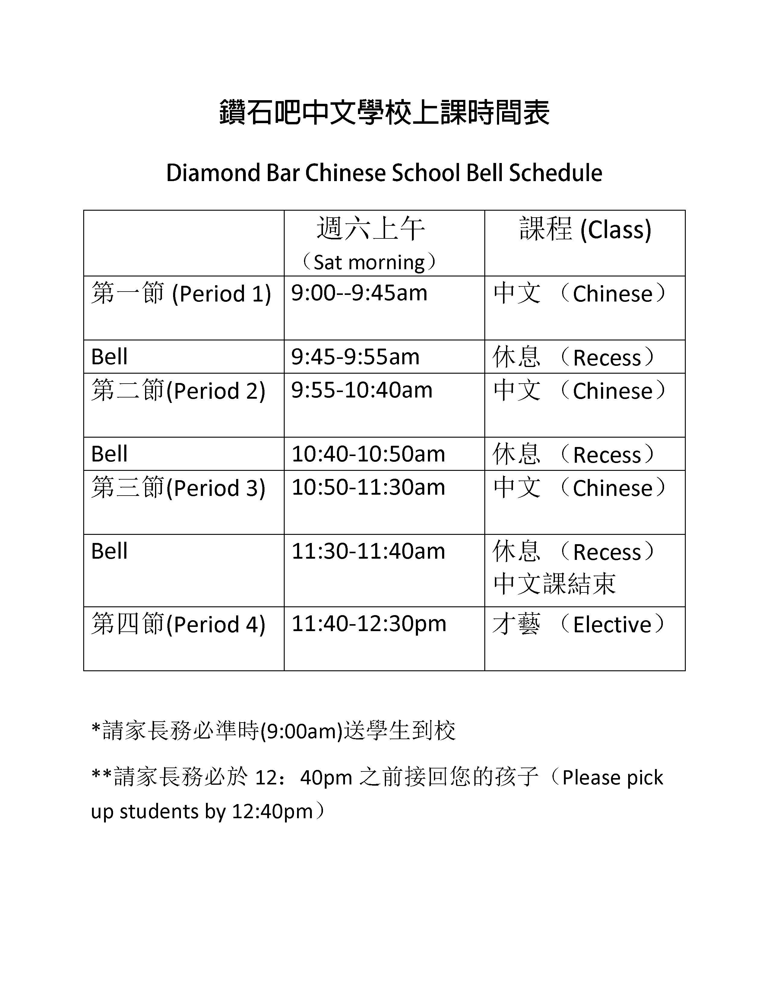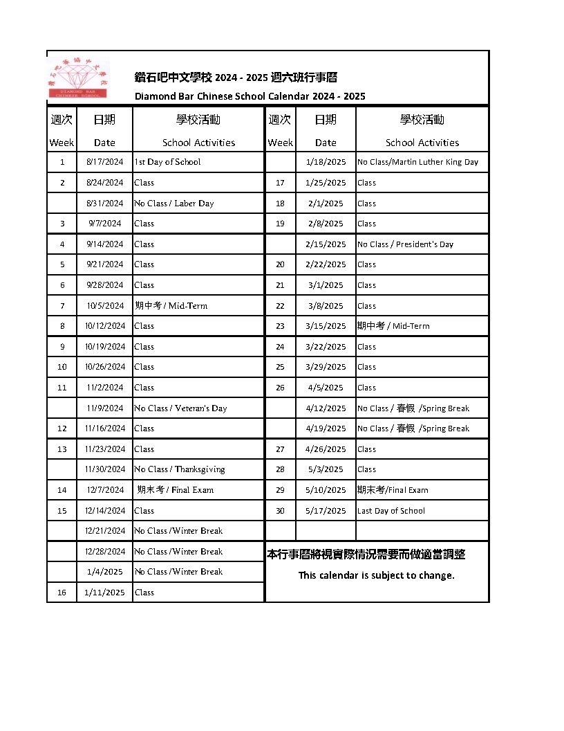 This Sat, 4/13, the Chinese school will have regular classes from 9:00am-12:30pm. Tennis class may be cancelled if the ground is wet or it rains. If it rains, tennis class students can go to 301 to wait for pick up. The Yoga class for parents will return to normal time: 9:30-10:30am. Early registration for the 2024-25 academic year starts this Sat. You can obtain the registration form from our website, http://www.dbcaa.org/viewthread. ... 1&extra=#pid712, or from our office. Registration can be done anytime during school hours. This Sat, 3/23,, the Chinese school will have regular classes from 9:00-12:30. For students of the tennis class, please bring racket with you. Just in case the weather is not cooperating, students can stay in Room 301 until parents can pick up. Parent Yoga class time will be changed to 10:30-11:30am, just for this Sat.. After this Sat, we will have our Spring Breaks. So, NO class on 3/30 and 4/6. This Sat, 3/23, between 9:00-10:15am, we will have an information/discussion session regarding classes for 2024-25 academic year, such as which elective classes should our school have, etc. We welcome parents to participate in the discussion. The location will be 307. 各位家长, 本周六, 中文学校正常上课。 大多数班级会有期中考试。希望同学们认真准备。 五月十八日,5/18, 是中文学校这个学年的最后一天。学校将在钻石吧高中的礼堂举行结业式及文艺汇演。一些班级将会集体表演节目。我们也将安排一些个人(学生和家长)或者包括中文学校学生的一些校外团体的精彩演出,比如唱歌, 乐器,舞蹈等。 欢迎家长们推荐。另外,我们需要一到两位家长参与这次活动的组织, 包括遴选节目等。 如果有意愿,请与我们联系。 学校的春假是3/30和4/6. 谢谢! Dear Parents, This Sat, 1/13, there will be no Chinese school as we follow the district to observe the MLK long weekend. Next Sat, 1/20, DBCS will have regular classes, including all elective classes and the Yoga class for parents. Thank you very much! DBCS Dear Parents, This Sat, 12/16, will be the last day of the Chinese school in the year 2023. We will then have the winter break. Next semester starts on 1/20/2024. All classes will regular for this Sat. Happy holidays! Winter break is very important for our students to improve their Chinese at home. For some, it is time for them to make up classes they missed, especially for those who have missed extended periods of time. Many apps are available now to help students to practice pin yin and learn Chinese characters. For others, it is time to use their Chinese language skills to enjoy. We recommend watching movies or TV shows in Chinese, learning songs and poems in Chinese, etc.Teachers may have suggests for students too. We hope everyone can improve. For students of the "paper sculpture" class, your teacher asks you to put your "almost finished" art piece in a box so that it would not get bent or broken. For parents of dance class students, the default classroom for the dance class is 851. They will move to other classrooms if, and only if Room 851 is occupied by DBHS groups. From next year, we will start to use our new website: www.dbcaa.com. Please find our school information and weekly updates here: http://dbcaa.com/chinese_school.php 各位家长, 本周六,中文学校正常上课。寒假四周,新学期2024年1月24日开始。 祝所有人节日快乐! 寒假是中文学习的重要时间段。对那些因为各种原因缺课的同学,希望努力利用假期把这些课程补上。对于拼音薄弱,或者写字不熟悉的,可以利用很多App来帮助学习和巩固。对于其他的同学,假期可以看看中文的影视节目,学一些中文歌和一些中文的诗词。老师也可能给同学们一些假期的任务。希望在假期之后,我们能够看到大家的进步。 请纸雕课的同学把自己的作品放在一个盒子里,防止挤压,使得作品被破坏。 舞蹈课的教室是851,只有当851无法使用的时候,会使用其他的教室。 从明年起,我们将开始使用新的学校网址, www.dbcaa.com。学校相关重要信息及每周的通知都可以在这里找到。请家长们记住这个网址。 谢谢! 节日快乐! DBCS202 Dear Parents, This Sat, the Chinese School will have regular classes from 9:00-12:30pm. In the month of December, we will have classes on 12/2, 12/9, and 12/16. Next semester starts on 1/20/2024. If you want to check the calendar to plan your vocation, please go to our website: https://www.dbcaa.com/chinese_school.php。 各位家长, 本周六, 中文学校正常上课。 12月,中文学校有三次课, 分别是12/2, 12/9, 和12/16. 寒假之后,新学期1/20/2024开学。 如果您需要查看学校行事历,请前往学校网站 https://www.dbcaa.com/chinese_school.php 谢谢! DBCS Dear Parents, This Sat, the Chinese school will have regular classes from 9:00-12:30pm. Rain is in the forecast for Sat. At this time, we are not sure when and what condition the tennis court will be in. Students please still bring your rackets. If it rains, or if the tennis court is too wet, we will have to cancel the tennis class. If it is cancelled, students can wait in the office for pick up. All other classes will be normal. Congratulations to Michelle Hsu, the 2nd place winner in the Chinese Calligraphy contest by SCCCS! Our DBCS handwriting contest result is out too. Congratulations! The list of outstanding students from each class will be posted on our website. 各位家长, 本周六,中文学校正常上课。 网球课的学生及家长请注意, 天气预报周六可能有雨,如果下雨或者网球场地太湿无法使用,网球课会被取消。 如果取消,请同学们到办公室等候家长来接。 所有其他班级正常。 祝贺7册班的许家琪在南加州中文学校联合会的书法比赛中获得第二名的好成绩。 钻石吧中文学校的硬笔书